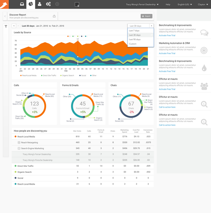 Developed low-fidelity sketches and wireframes for key screens, like the dashboard and lead management view, enabling rapid iteration and refinement based on feedback from ReachLocal stakeholders.