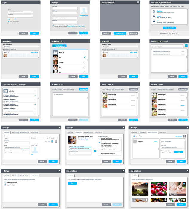 Developed detailed wireframes that included specific layouts for the main dashboard, album views, and sharing interfaces, ensuring the design supported easy navigation and content management.
